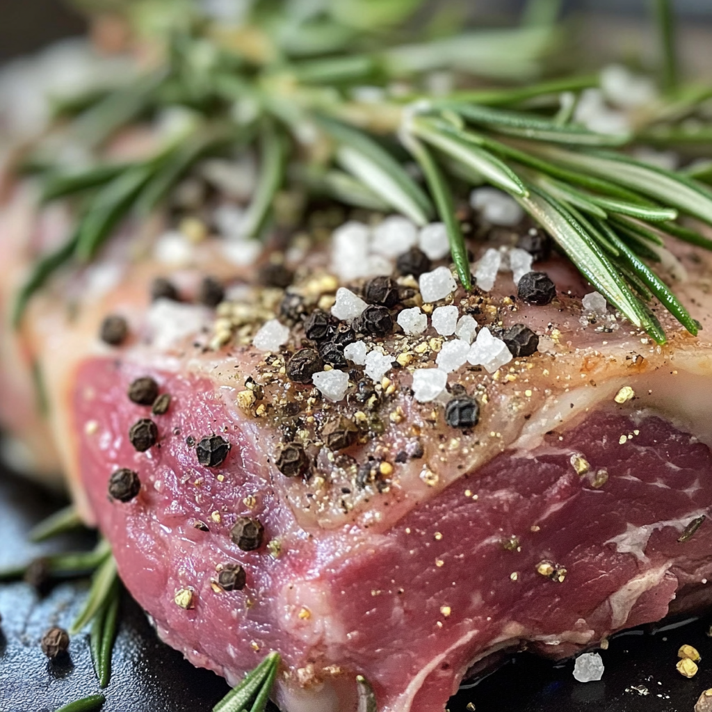 Once the spice mix is made, grind it up and season the pork flesh with it. Use a drizzle of oil on the pork first, and then smear the spices over the flesdh.